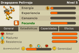 Una vez tenemos el pavo salvaje hay que subirle las 3 barras que salen en estadisticas (amor/madurez/resistencia). Ademas de esas 3 barras, nos aparece otra mas ( la baarra de equilibrio; agresividad/serenidad), esta 3ª barra nos indica la estadistica que se le puede subir al pavo en ese momento.